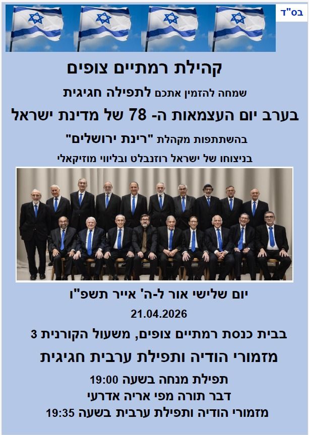 תפילה חגיגית בליל יום העצמאות ברוב עם, בשעה 19:15, כולל שיחה מאת הרב קנאי