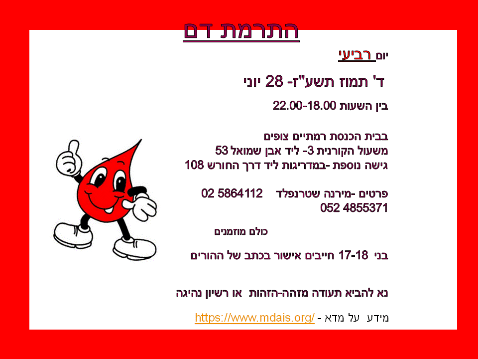 בשבת תהיה קידושא רבה בחסות משפחת האם, אחרי המניין של 8:40. הם חוגגים את מסירת ספר התורה המשפחתי, בהשאלה, לבית הכנסת שלנו, וכן שנה לעלייתם ארצה. אנחנו זקוקים לכמה זוגות ידיים להעלות את המצרכים לחצר ולנקות לאחר הקידוש. בשבת הבאה יהיה בע”ה ‘קידוש קטן’ ונשמח אם הציבור יביא מצרכים (לא תוצרת בית).