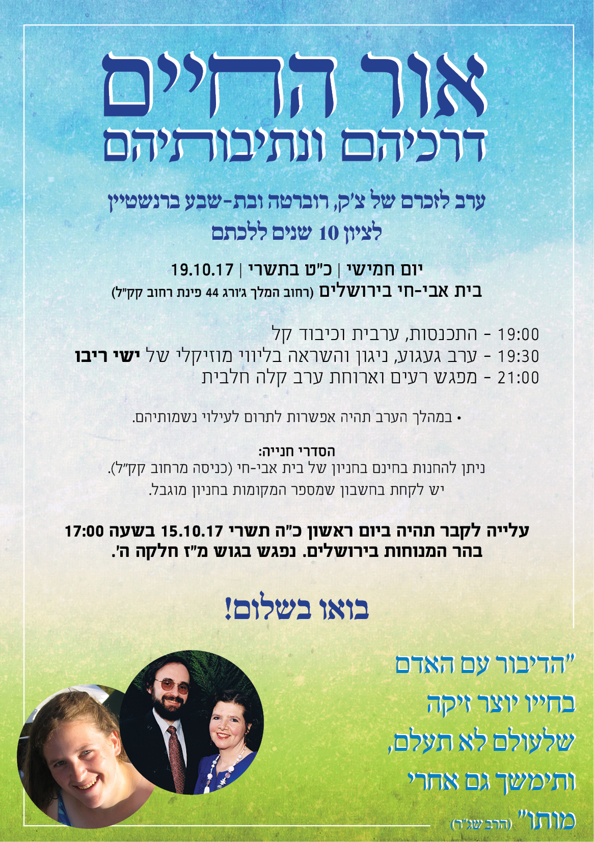 Memorial Service marking ten years since the accident in which Chuck, Roberta and Batsheva Bernstein perished.