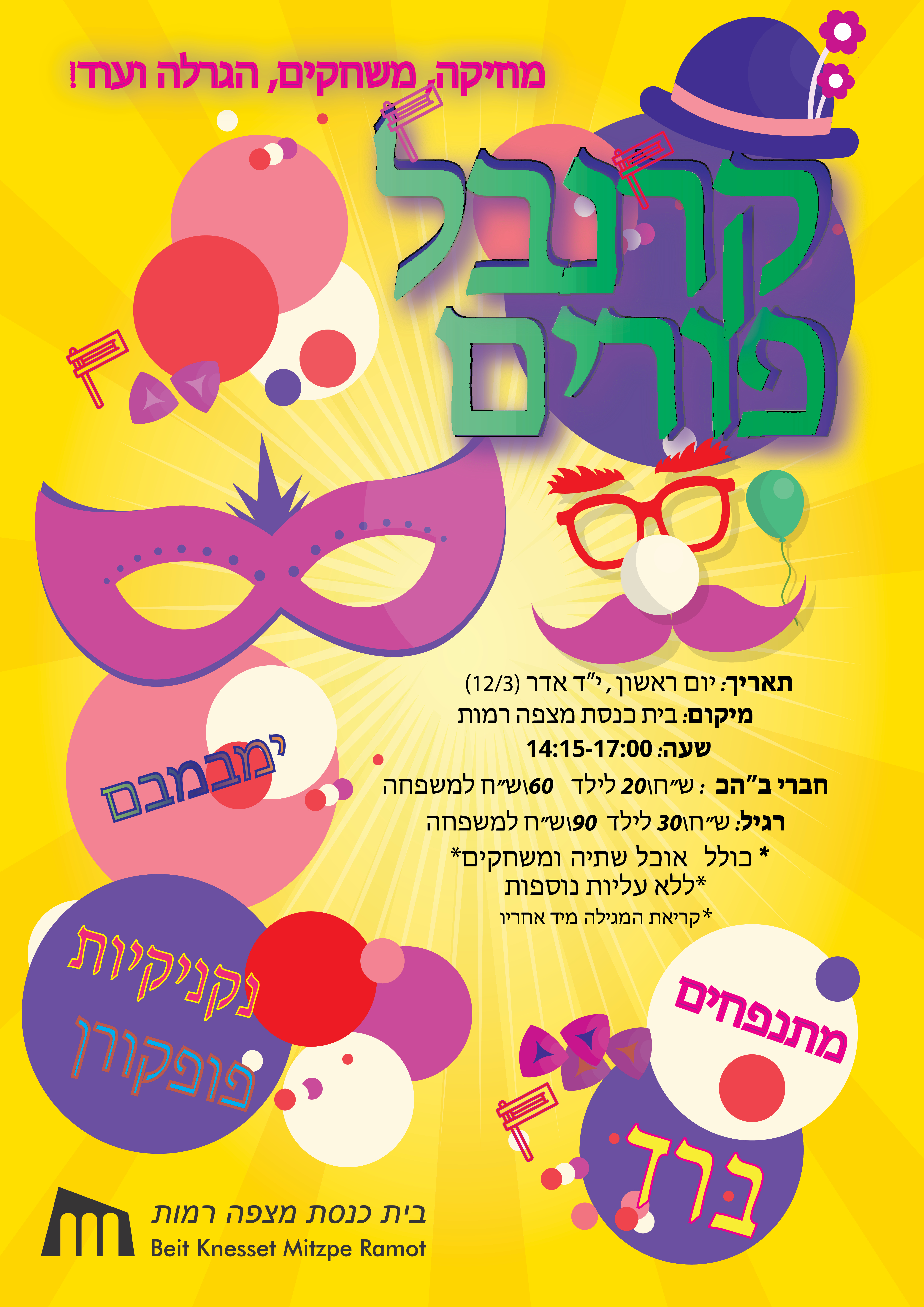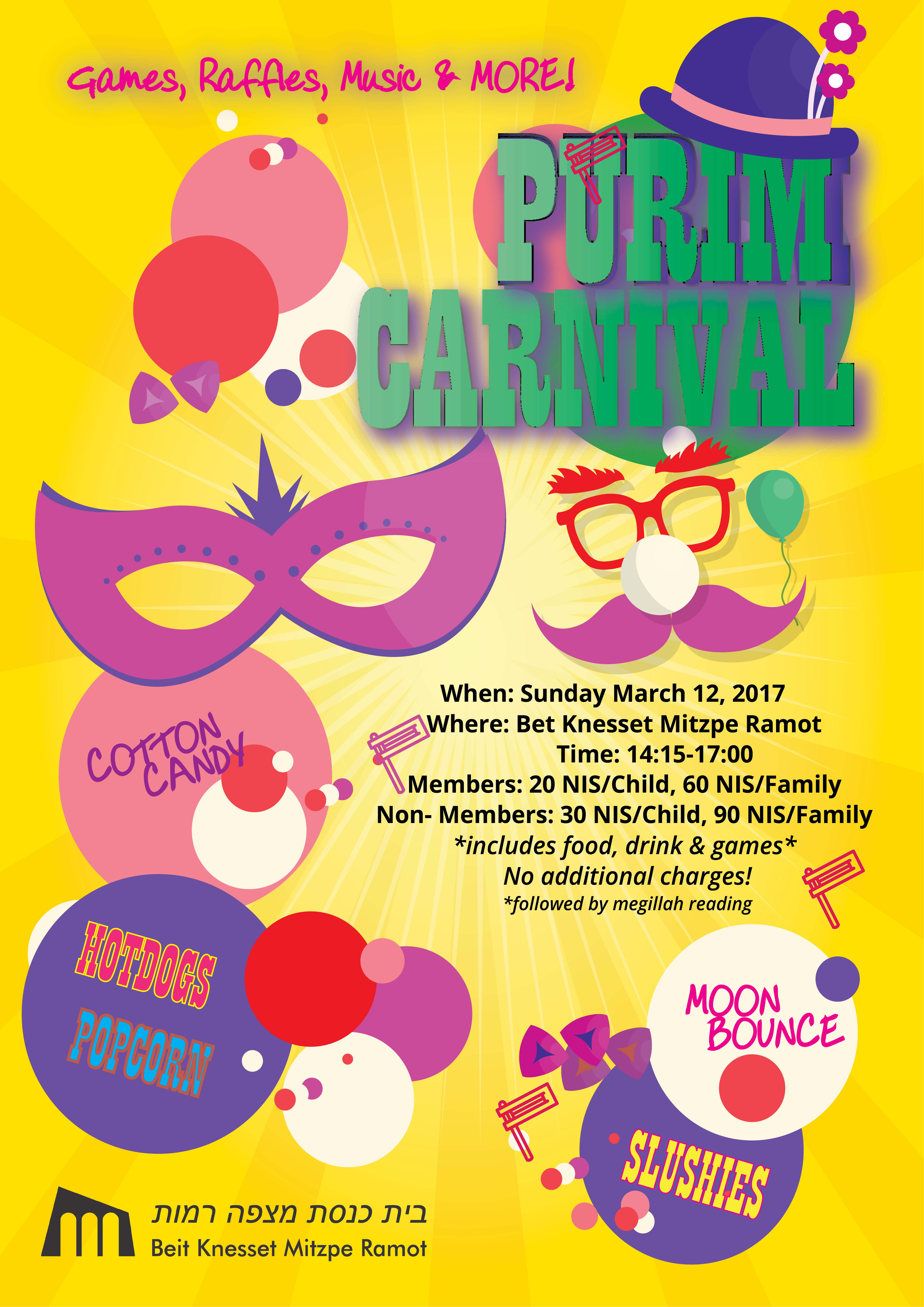 The Annual Mitzpe Ramot Purim Carnival will take place in the afternoon of Erev (Shushan) Jerusalem Purim, Sunday March 12th, 14 Adar, starting at 2:15 pm, in the shul courtyard.