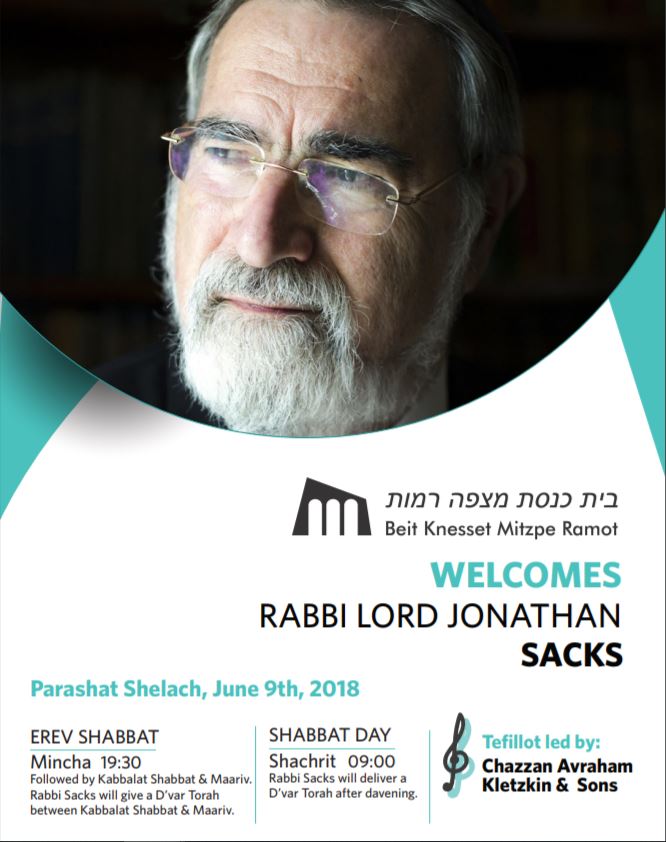 On Shabbat, 9th June, Parshat Shlach, we have the honour of hosting Rabbi Lord Jonathan Sacks, as a guest speaker.