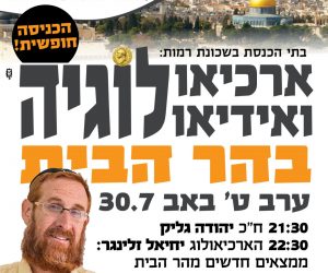 The shuls of Ramot, with the matnas, have organized an evening of guest speakers for Sunday night, July 30th, at 9:30 pm, at the Matnas, 6 Recanati above the library (the evening of 8th Av). MK Yehuda Glick and the archeologist Yechiel Zelinger will address the topic ‘Ideology and Archeology at Har HaBayit’. Tamar Hayardeni will moderate.