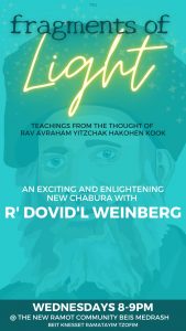 Rav Dovid’l Weinberg has started a series of shiurim after Mincha (on Sundays and occasionally during the week) on Torat HaRav Kook.