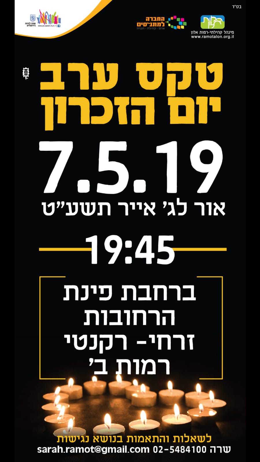 The Ramot community is commemorating Yom Hazikaron, and celebrating Yom Haatzmaut next week. Details on the above flyers.
