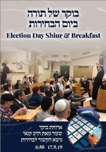 This Tuesday, 17 September, election day, there will be a breakfast and shiur with Rav Kannai, starting at 8:50am