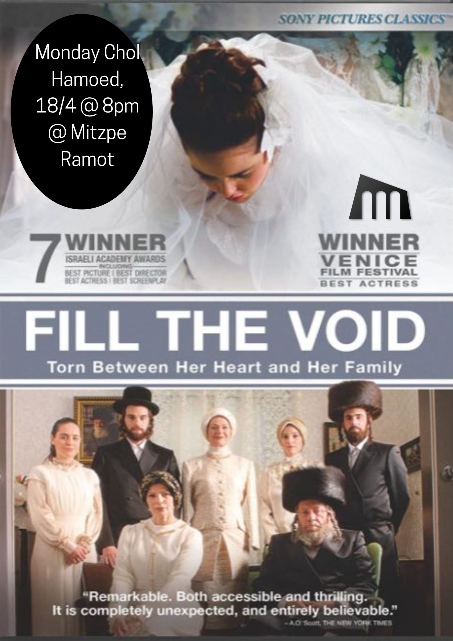Monday chol hamoed, 18th April at 8pm, join Mitzpe Ramot for a showing of the movie “Fill the Void”