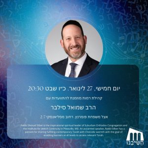 This Thursday, 27 January at 8.30pm, hashiveinu will be hosting Rav Shmuel Silber for an evening of Torah, food and music at the Pomerantz family home, 2/7 Rechov Masliansky, Ramot Gimmel.