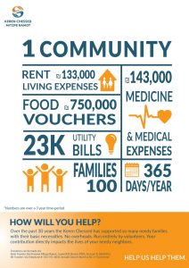 The Keren Chessed helps families put food on the table by providing them with food vouchers before each chag and during the summer. It helps families buy medication when they have to choose between buying food or buying medicines. It pays electric bills when a family is about to have their electricity cut off. It helps pay rent so that a family with small children won’t be evicted from their flat. It has bought heaters and blankets, provided hachnasat kallah and have even helped with dental bills and bought refrigerators when they broke down and the family had no money to replace it.