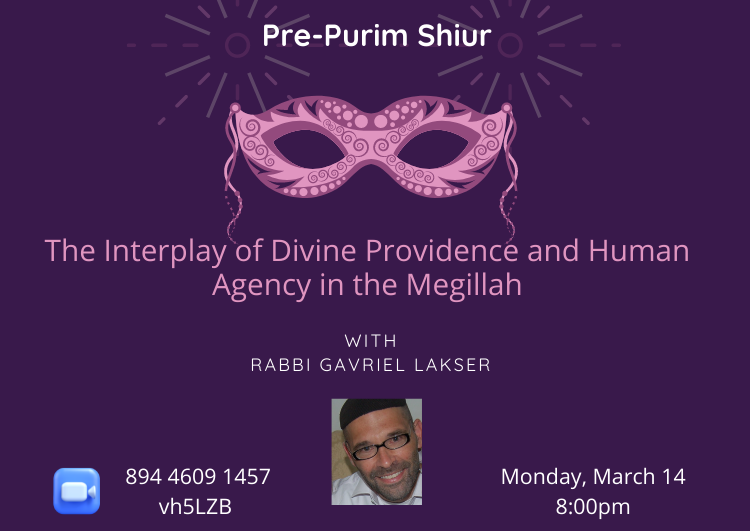 Rabbi Gavriel Lakser is giving a shiur on Megilla on March 14 over Zoom.