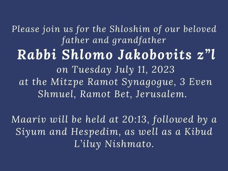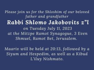The Pardes/Jakobovitz family invite the community to a siyum to mark the shloshim of their beloved father and grandfather this Tuesday, 11 July after Maariv at the shul.