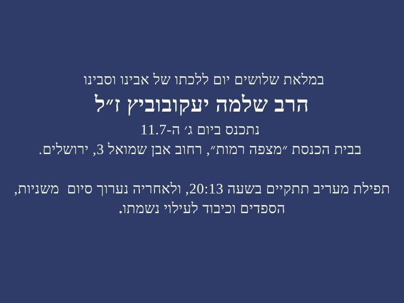 משפחת פרדס/יעקובוביץ מזמינה את הקהילה לסיום לציין את השלושים של אביהם וסבם האהוב ביום שלישי, 11 ביולי אחרי מעריב בבית הכנסת