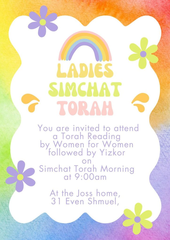 Please join us to celebrate Simchat Torah with a women’s Torah reading that will also respectfully mark the complexity of the chag this year. The reading will take place the morning of Simchat Torah at the Joss house, 31 Even Shmuel at 9:00 .