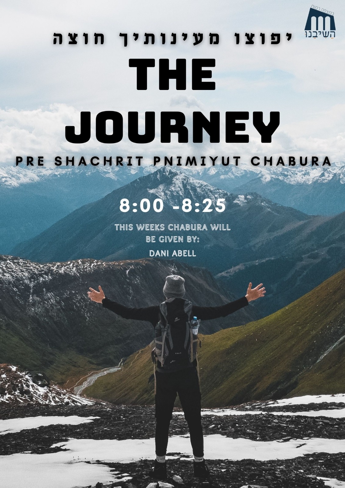 Pre-shacharit pnimiyut chabura for men this Shabbat at Hashiveinu during the open Beit Midrash will be given by Dani Abel