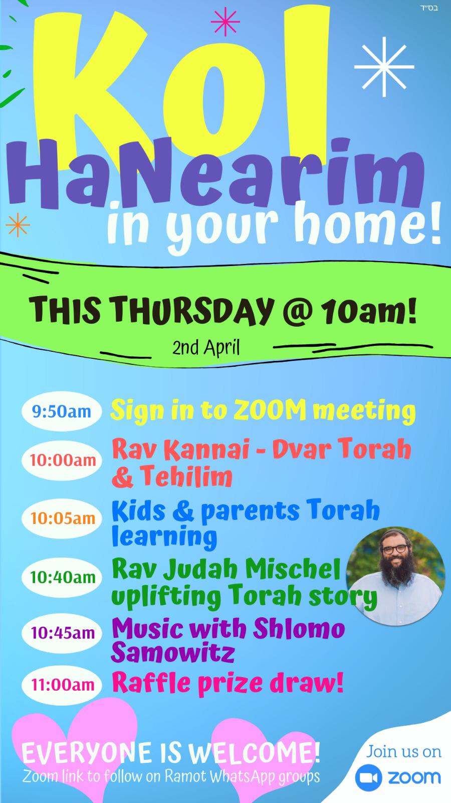 This Thursday at 9:50 we will continue the Kol Hanearim virtual learning program with special guest appearance by Rav Judah Mischel and music with Shlomo Samowitz!