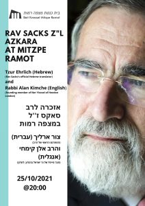 ביום שני הקרוב 25 באוקטובר בשעה 20:00, יהיה ערב אזכרה לרב יונתן סאקס בבית הכנסת. שיחות מאת צור ארליך, המתרגם לעברית הרשמי של הרב, ורב אלן קמחי, חבר מייסד ורב לשעבר של קהילת נר ישראל בהנדון, לונדון.